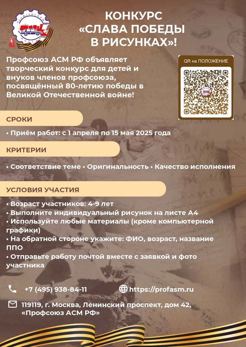 Конкурс «Слава Победы в рисунках», посвященный 80-летию Победы в Великой Отечественной Войне. Организатор Конкурса – Профсоюз АСМ РФ. К участию в Конкурсе приглашаются дети и внуки членов Профсоюза АСМ РФ в возрасте от 4 до 9 лет включительно. Конкурс проводится с 1 апреля 2025 года по 15 мая 2025 года. На конкурс принимаются детские рисунки, выполненные индивидуально. Работы, выполненные коллективом авторов, не принимаются. Участники Конкурса выполнен рисунок в любой технике. различными художественными материалами на листах формы А4.