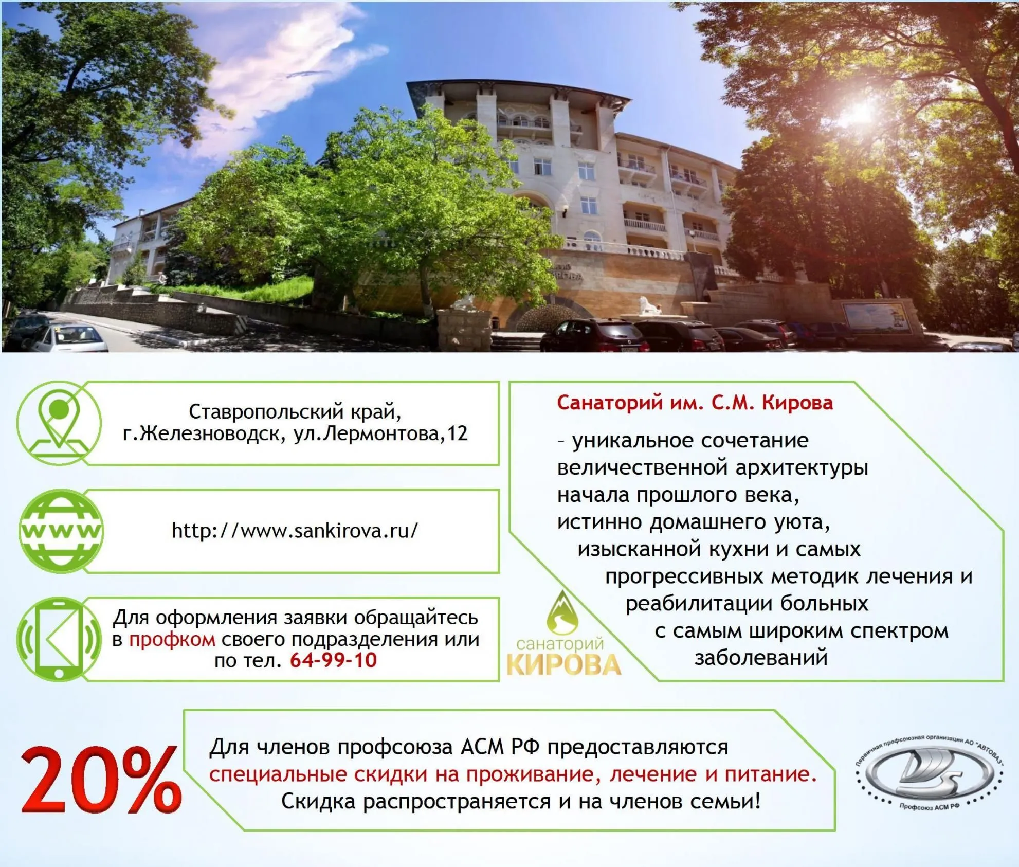 6. Санаторий им.С.М.Кирова (Ставропольский край, в г.Железноводск), предоставляет самые разные программы лечения и варианты размещения. На 2023 год для членов профсоюза АСМ РФ также предоставляются специальные скидки на проживание, лечение и питание в данном санатории.Для оформления заявки обращайтесь в профком АНО.