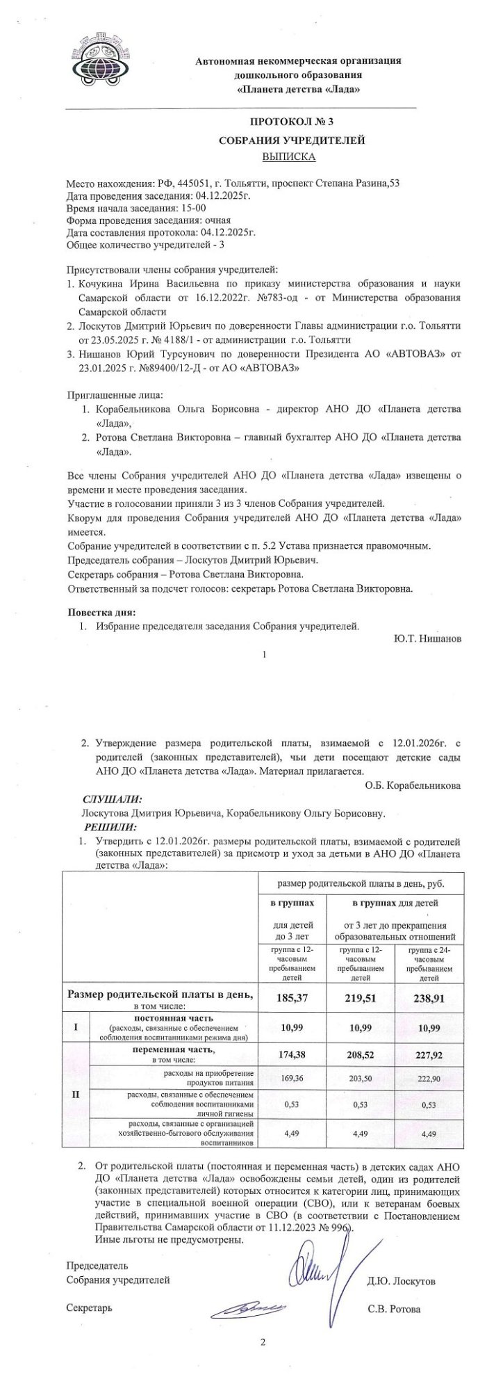 Документы об установлении размера платы, взимаемой с родителей (законных представителей) за присмотр и уход за детьми, осваивающими образовательные программы дошкольного образования в организации, осуществляющей образовательную деятельность: